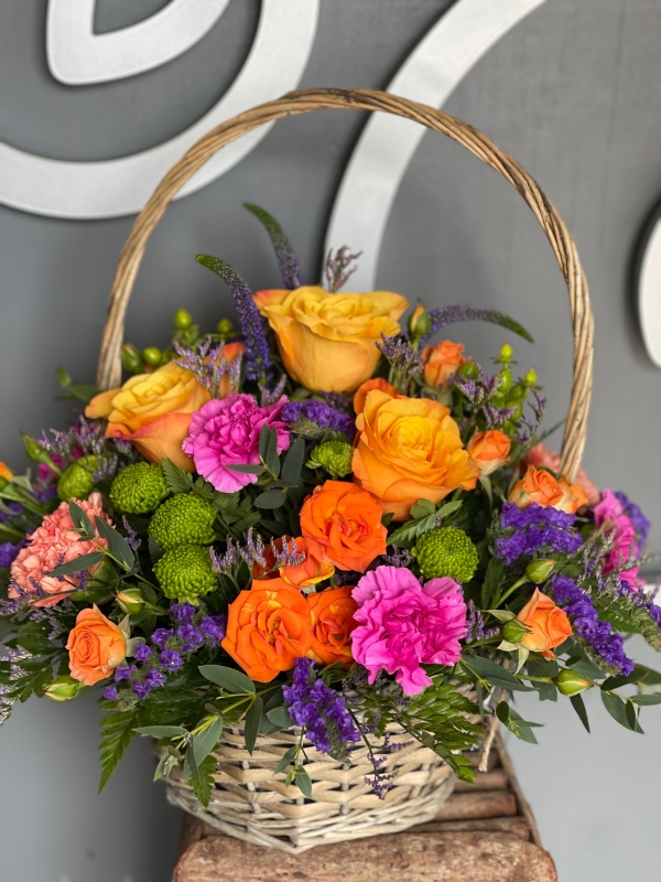 A bright and colourful selection of flowers in a wicker basket.